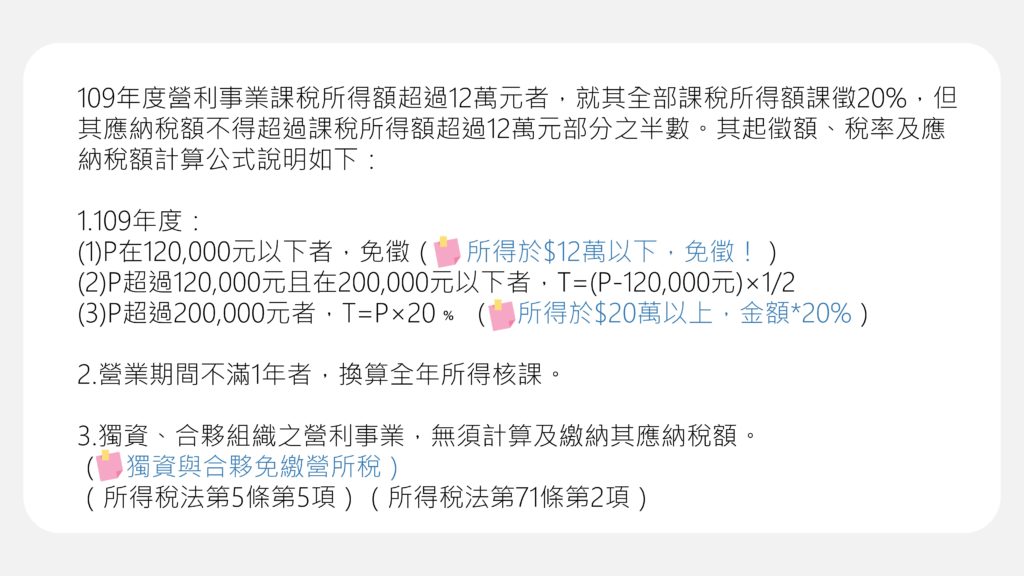 - 所得額在12萬以下:不需要繳稅,稅額$0。