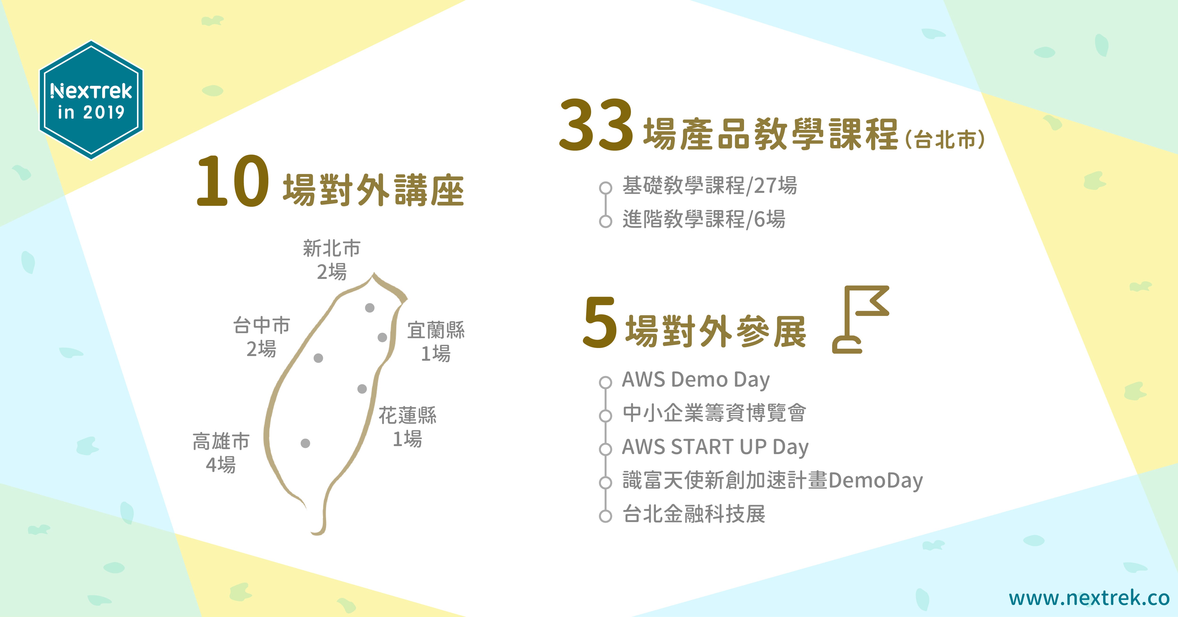 除了我們公司所在地的台北市外,我們透過與各地方機構的合作,開啟跨出雙北區域以外的商業推廣,一共累積了10場的公開講座與5場參展活動。其中更有許多客戶,或許沒有參加過我們的教學課程或活動,仍願意信任我們的產品,透過線上客服的方式,學習與付費使用,我們衷心感謝!