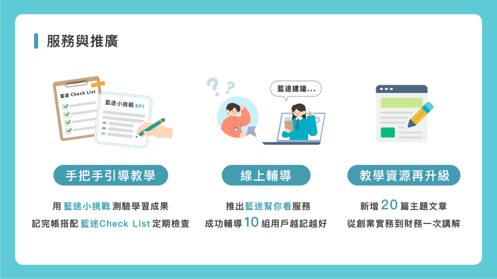 為了讓財務觀念更簡單易懂,我們推出內外帳懶人包、現金流量 v.s 損益表的拆解,針對年底衝刺期間,我們更製作了「歲末三部曲」教學影片,從預算規劃、結帳到補帳,一次輕鬆做好年底的財務總結。